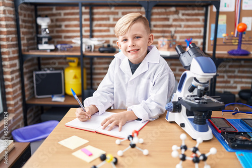 Adorable toddler student smiling confident writing on notebook at classroom