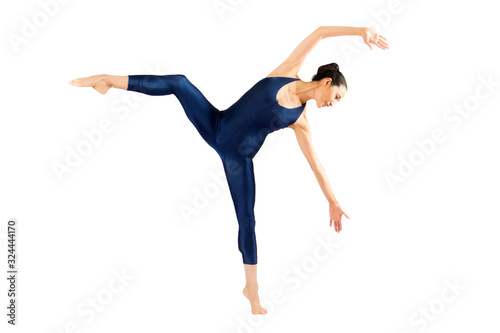 Adult woman dancer in blue bodysuit dancing in the studio.