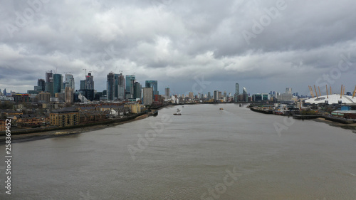 Aerial bird's eye view photo taken by drone of Canary Wharf skyline as seen from river Thames with beautiful cloudy sky, Isle of Dogs, London, United Kingdom