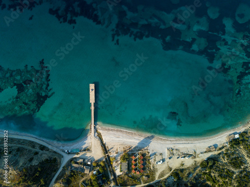 Aerial birds-eye view of Bunec Beach in Piqeras, Albania (Albanian Rivieria)