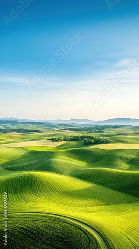 Aerial of rolling plains with patchwork fields of crops in varying shades of green and yellow, stretching out to the horizon under a clear blue sky