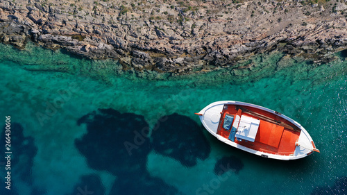Aerial top view photo of beautiful colourful traditional fishing boat near village of Panormos with turquoise crystal clear sea, island of Tinos , Cyclades, Greece