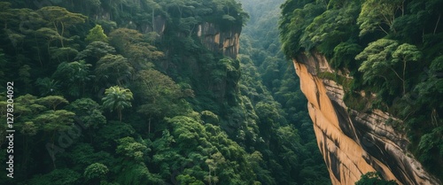Aerial view of a dense green forest with steep rocky cliffs and misty mountainous backdrop in the daytime