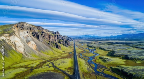 Aerial View of Iceland's Majestic Landscape: A Long Road Amidst Green Mountains and Dynamic Sky