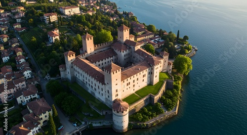 Aerial View of Medieval Castle on Waterfront with Tiled Roof
