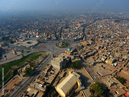 Aerial view of roundabout and cityscape with dense buildings and busy roads, Multan, Pakistan.