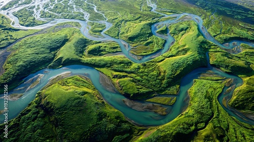 Aerial view shows Iceland's twisting rivers and green land, showing off its natural beauty.