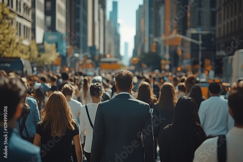 African American Man in Gray Suit, Back View, City Crowd Blur