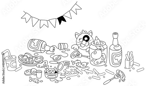 After a joyous celebration, a funny fat cat in good mood on a festive table among various drinks and tasty food, black and white outline vector cartoon illustration isolated on a white background