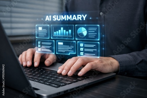 AI summary dashboard concept displayed above laptop keyboard interface. Ai generative