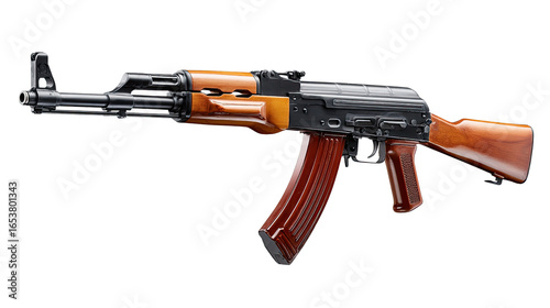 AK-47 Rifle: A meticulously captured image of an AK-47 rifle, showcasing the weapon's distinctive design, powerful presence, and historical significance.