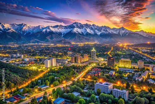 Almaty Cityscape Dusk Aerial View - Panoramic Mountain Scenery