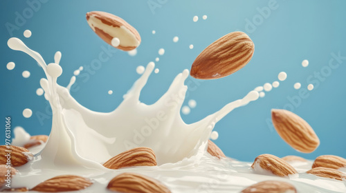 Almonds flying in milk splash isolated on white background. Nuts in organic liquid.