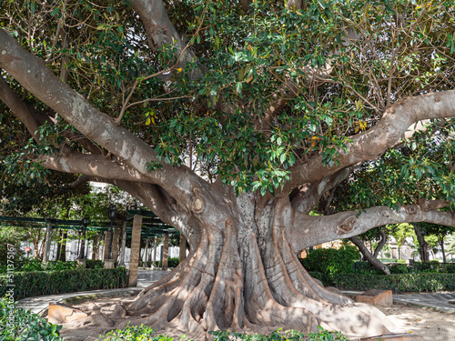 alter, großer Gummibaum in der Stadt Cadiz, Andalusien, Spanien, ficus elastica