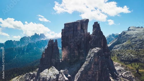 Amazing aerial view of Dolomite Mountains, Italy. Cinque Torri, Five Towers