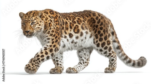 Amur leopard walking forward on white background. Endangered wild cat species with distinctive spotted coat pattern. Wildlife conservation photography portrait
