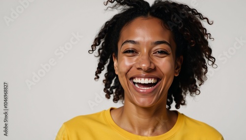 An African-American woman with long curly hair smiles and laughs sporting a yellow shirt