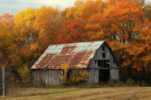 An aged barn stands in a vast field, surrounded by tall trees and under a clear sky, A dilapidated barn in an autumn setting, AI Generated
