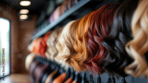 An array of colorful wigs, ranging from vibrant shades to natural tones, is beautifully displayed in a modern hair salon, showcasing variety and style in today's fashion world.