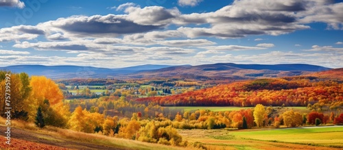 An art depicting a natural landscape with trees in the foreground, mountains in the background, cumulus clouds in the sky, and grassland leading to the horizon