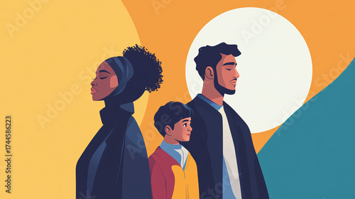 An elegant and empowering illustration of a Black woman, an Asian man, and a Middle Eastern child standing side by side, with bright colors highlighting their diversity and strength