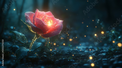 An enchanting rose with a radiant glow illuminates a mystical forest with magical sparkles.