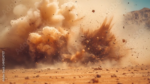 An explosion in the desert, with sand and dust flying everywhere and rocks floating around, High speed photography