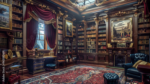 an image of a library in a Victorian mansion with velvet drapes and oil paintings