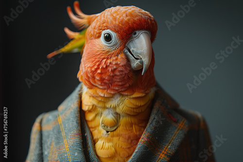 An individual in corporate clothing with a parrot's head, signifying effective communication and adaptability in professional interactions. Concept of vocal leadership. Generative Ai.