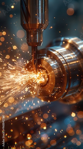 An industrial machine part surrounded by sparks during a precision machining process, showcasing craftsmanship and technology.
