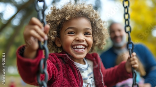 An interracial family enjoying a day at the park, the children laughing as they play on swings, the parents watching with love, captured in a vibrant, raw style