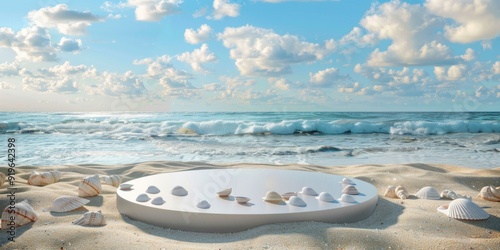 An inviting beach scene featuring a sand circle filled with seashells, offering a tranquil place for meditation and connection with nature.
