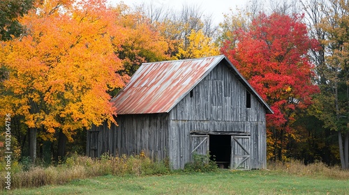 An old wooden barn with fall foliage.