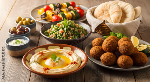 An overhead shot displays a vibrant spread of Middle Eastern cuisine, including hummus, falafel, tabbouleh, pita bread, olives, and vegetable skewers.