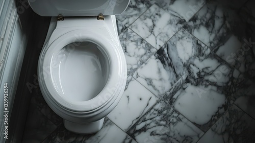An overhead view shows a white toilet on marble tile floor. It is ideal for illustrating cleanliness or modern bathroom design.