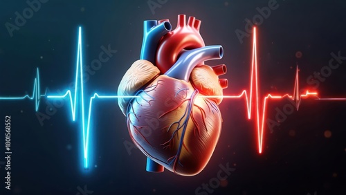 Anatomical heart graphic with pulsating blue and red waveforms on a dark background