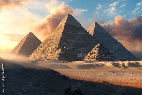 Ancient Pyramids Under Mystical Sunset Sky With Fog Over Sand Dunes In The Desert Scape