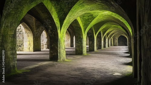 Ancient Stone Arches Covered in Green Moss, Underground Structure