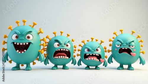 Angry Cartoon Virus Characters 3D Render Aggressive Expressions Teal Green Viral Illustration