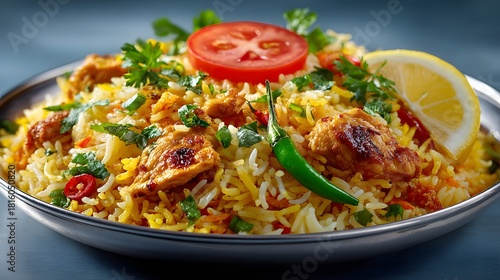 Appetizing studio shot of a delicious plate of chicken biryani on a simple metal plate, garnished with tomato, fresh green chilies, and lemon wedges.