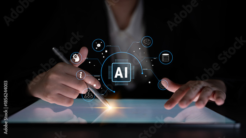 Artificial Intelligence (AI) as a core technology. A concept of an AI ecosystem powering data analysis, machine learning, and global networks. Motif