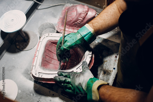 Artisan craftsman create mask based on plaster cast. Gypsum mold and plastic mask sculpting.