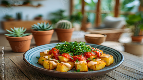 Artistic shot of a plate of patatas bravas topped with spicy tomato sauce and aioli, blurred rustic terrace
