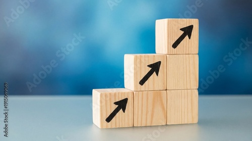 Ascending cubes with upward-pointing arrows symbolizing growth and progress. The blocks are arranged like steps, set against a soft, blurred background