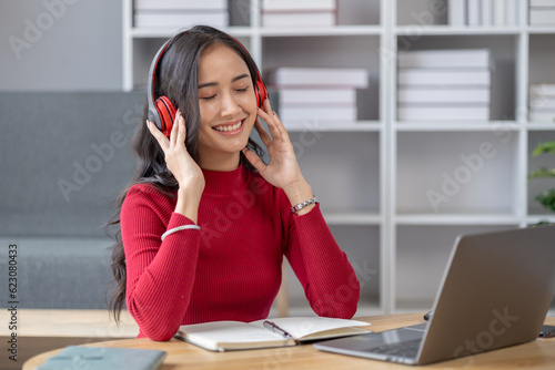 Asian beautiful woman sits in living room, she is college student listening to relaxing music, studying from home, online learning. University student concept.