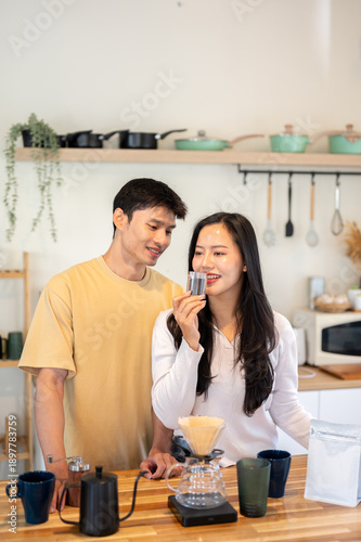 Asian couple man looking at a woman smelling powder aroma in grinder while making coffee in kitchen.