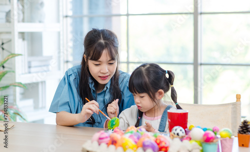 Asian cute little children girl wearing funny bunny ears headbands and young happy mother smile decorating painting eggs while sitting together in living room table family preparing for Easter holiday