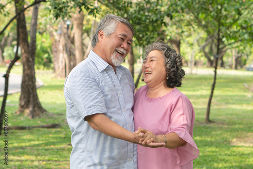 Asian healthy senior couple relaxing in the park together.