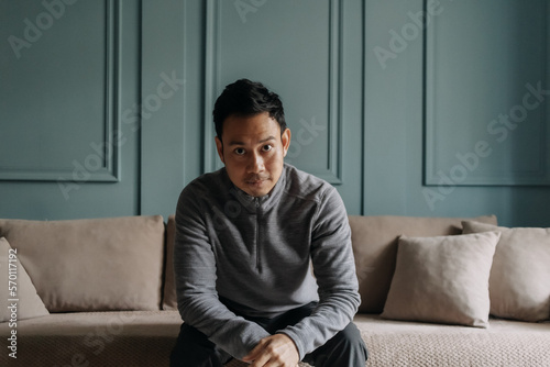 Asian man in fleece sitting in the living room in cold weather.