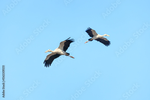 Asian openbill stork bird (Anastomus oscitans) flying in the sky, Wild Animal, Big bird